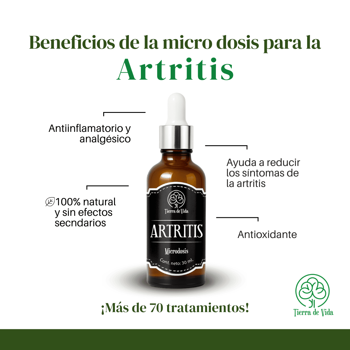 ¿Estás buscando una solución natural para el dolor y la inflamación causados por la artritis? ¡Nuestro producto en microdosis es la respuesta! Hecho con ingredientes de plantas poderosas, incluyendo uña de gato, sauce, jengibre, té verde, cúrcuma, manzanilla y ashwagandha, nuestro producto es el complemento perfecto para tu rutina diaria.