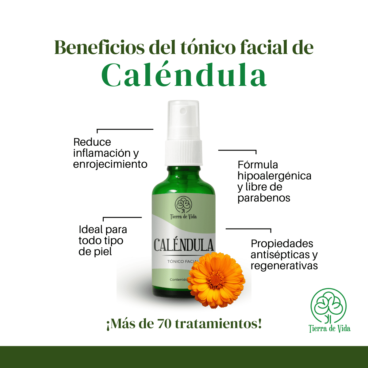 Además, su práctico formato en spray de 30ml te permite llevarlo contigo a donde quiera que vayas. Disfruta de los beneficios de la caléndula y dale a tu piel el cuidado que se merece con el Tónico Facial de Caléndula de Tierra de Vida.