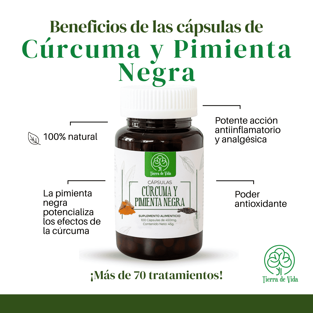 ¡Potencia tu salud de forma natural! Las cápsulas de cúrcuma y pimienta negra son el complemento perfecto para fortalecer tu sistema inmunológico, reducir inflamaciones y mejorar la digestión. La cúrcuma actúa como un potente antioxidante, mientras que la pimienta negra aumenta su absorción para maximizar los beneficios. Disfruta de una vida más activa y saludable con este maravilloso suplemento.