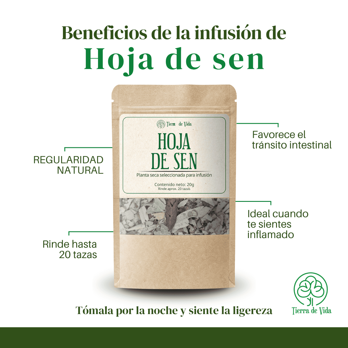 Hoja de Sen, planta para infusión, té, marca Tierra de Vida.
