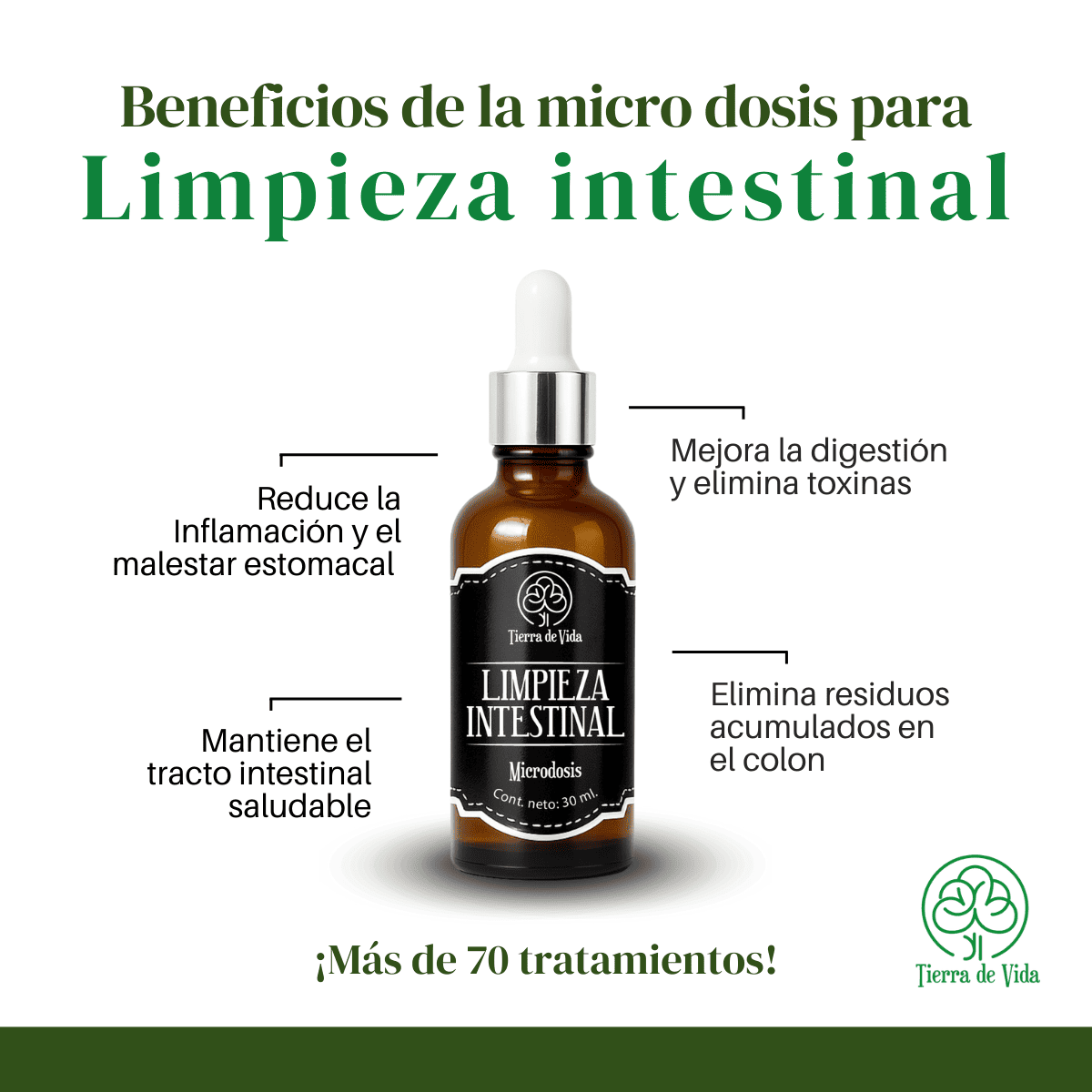 Nuestro producto es fácil de usar, sólo tienes que tomar 2 gotas debajo de la lengua 4 veces al dia, para empezar a notar sus efectos. ¡No esperes más para empezar a sentirte mejor! Prueba nuestro producto natural en microdosis para la limpieza intestinal y dale a tu cuerpo el cuidado que se merece.