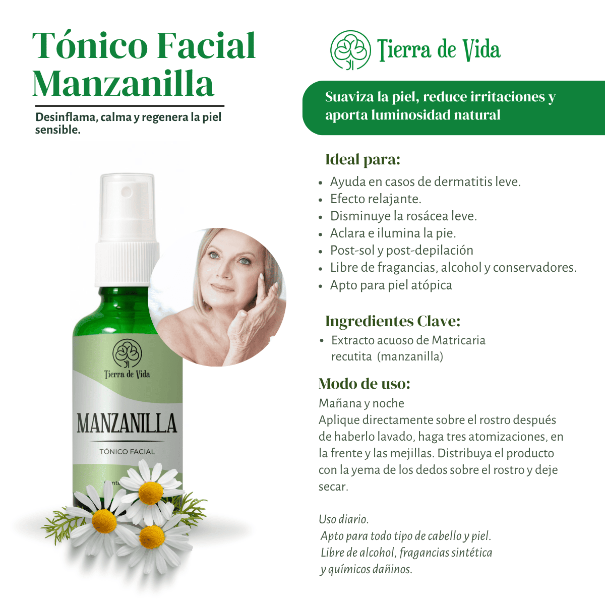 ¡Revitaliza tu piel con el Tónico Facial de Manzanilla de Tierra de Vida, en spray de 30ml!