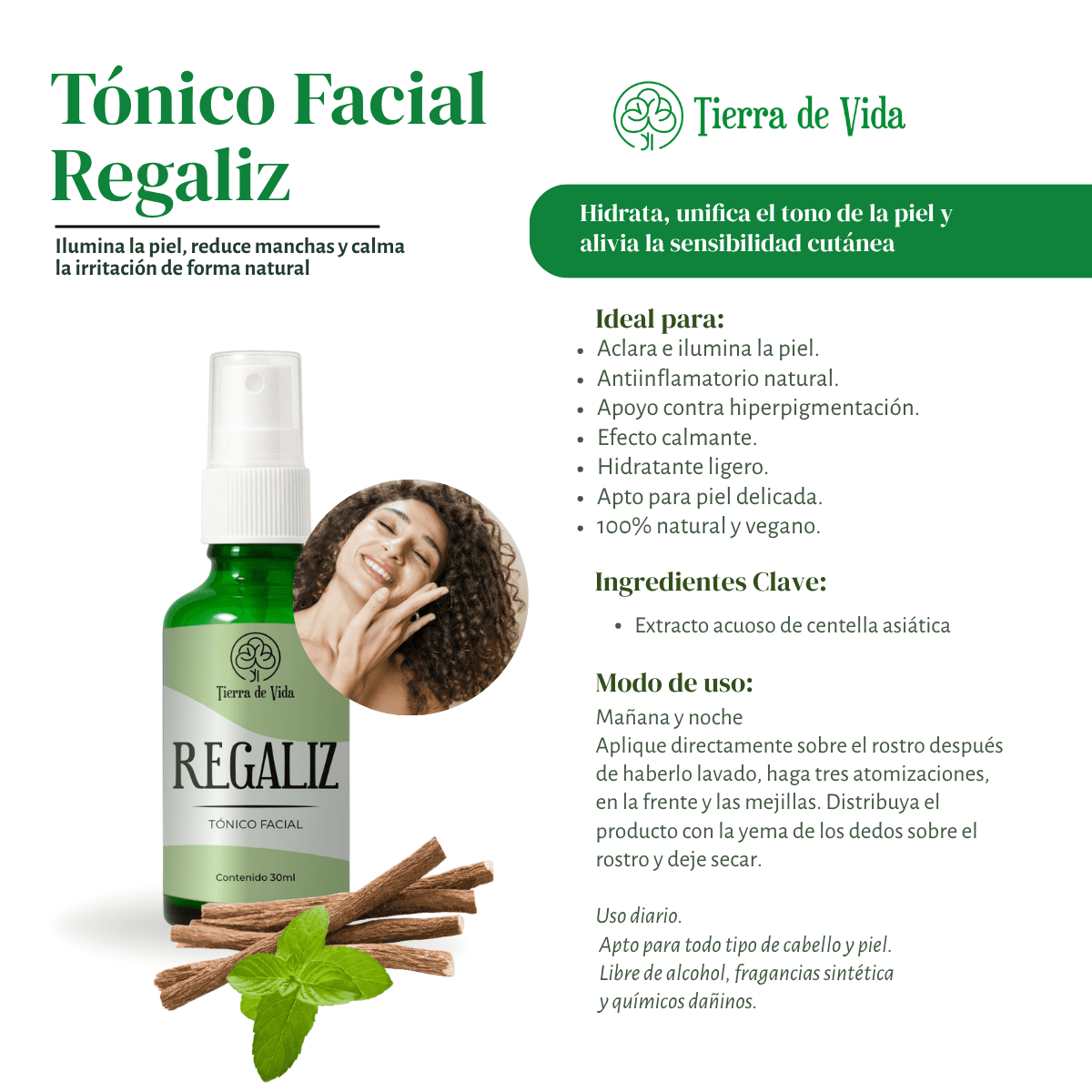 ¡Resalta tu belleza con nuestro increíble Tónico Facial de Regaliz! En spray de 30ml. Extracto natural. Marca Tierra de Vida. Este elixir de cuidado facial ha sido minuciosamente elaborado para brindarte una piel radiante y saludable.