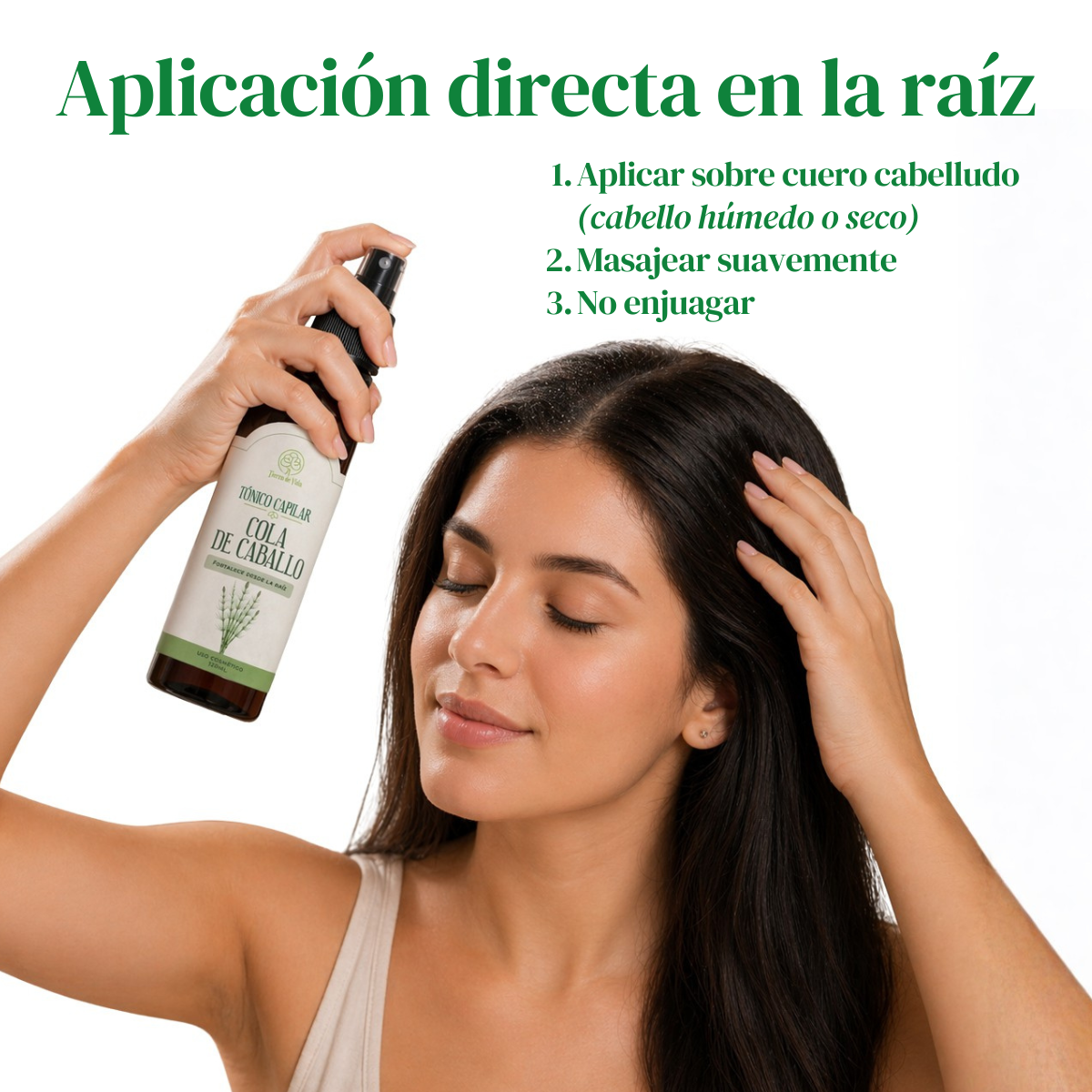 Aplicar directamente sobre el cuero cabelludo, con el cabello húmedo o seco. Masajear suavemente y no enjuagar.