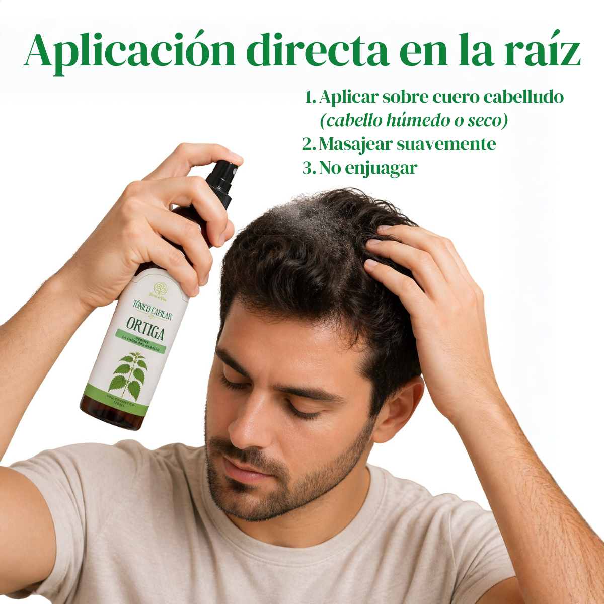 Aplicar directamente sobre el cuero cabelludo, con el cabello húmedo o seco. Masajear suavemente y no enjuagar.
