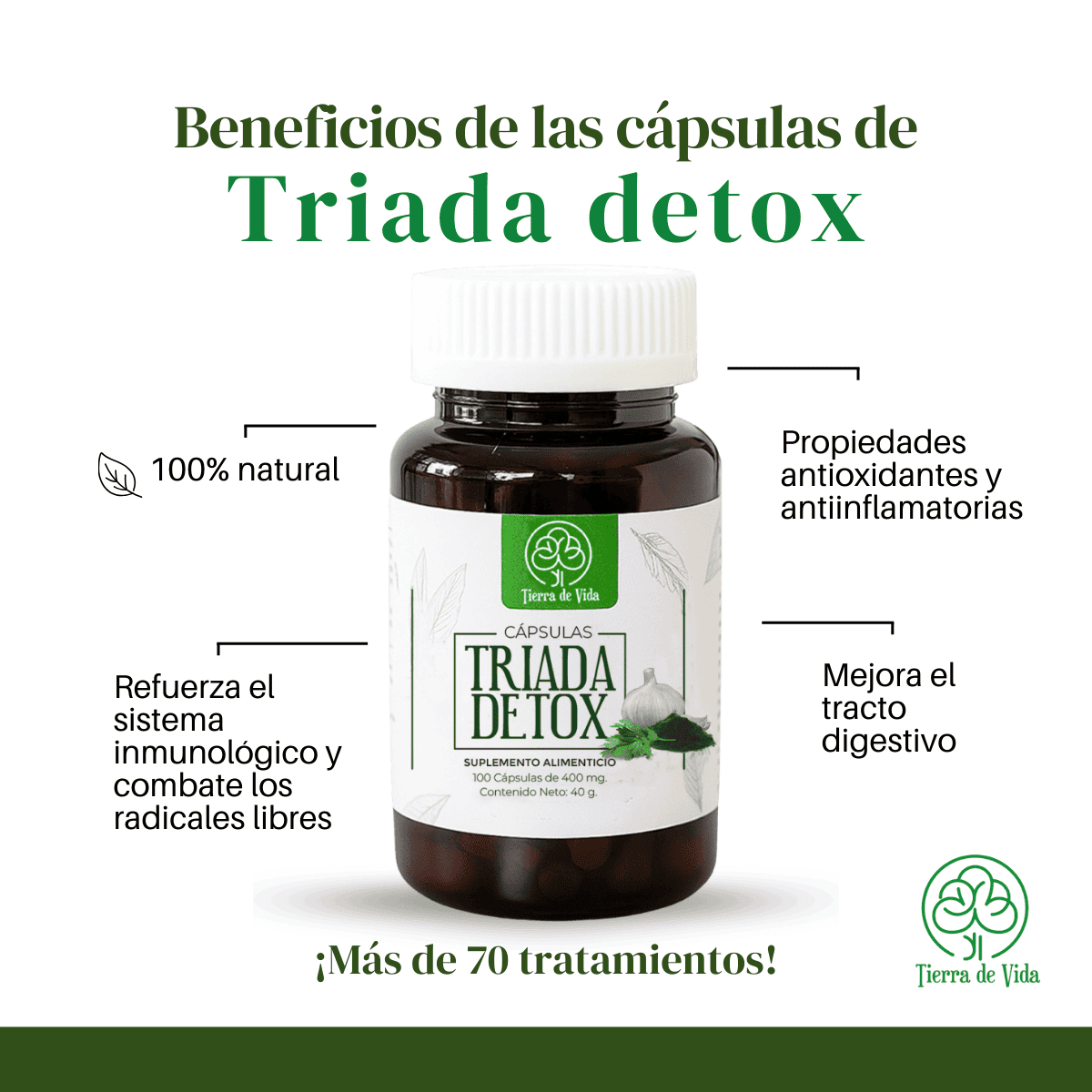 Nuestras Cápsulas Triada Detox están formuladas con una poderosa combinación de cilantro, alga espirulina y ajo, ingredientes naturales que trabajan juntos para limpiar y desintoxicar el cuerpo de manera eficaz. Estas cápsulas ayudan a eliminar toxinas, mejorar la función digestiva y fortalecer el sistema inmunológico, promoviendo una salud óptima y un bienestar general.