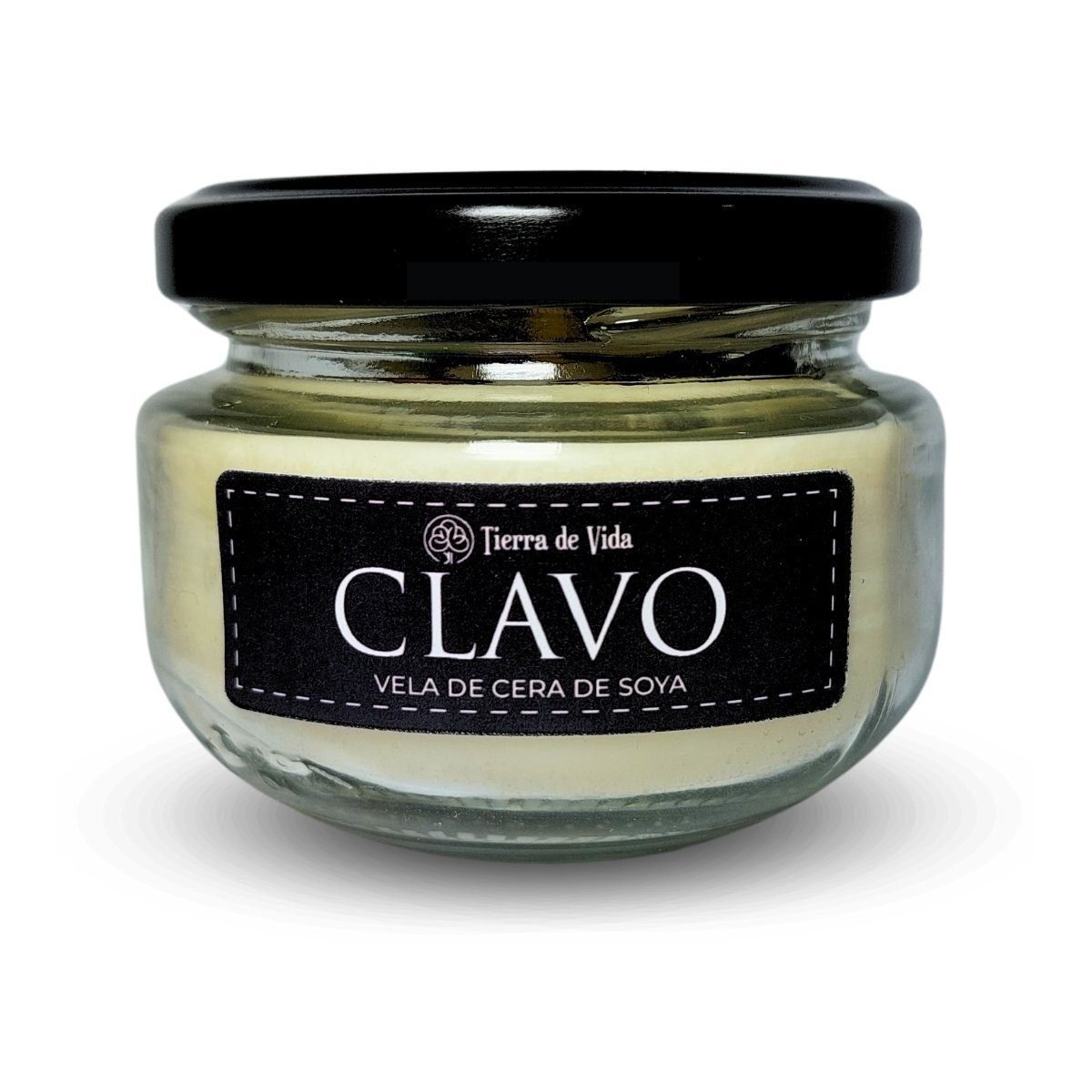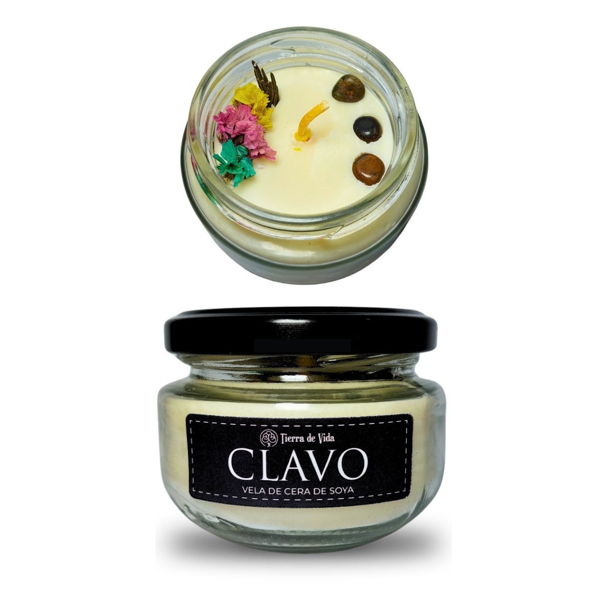 Vela de cera de soja, aroma clavo, con cuarzos.